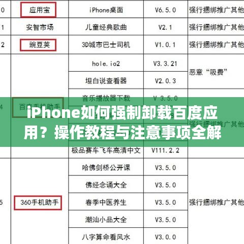 随着智能手机的普及,iPhone已成为人们日常生活中不可或缺的一部分,有时我们可能需要强制卸载某些应用程序以释放存储空间或优化设备性能,本文将介绍如何在iPhone上强制卸载百度应用,同时提供一些相关的注意事项。