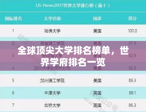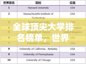 随着全球化的步伐不断加快,教育领域的国际交流与合作日益频繁,世界大学排名,作为衡量各国高等教育质量的重要指标之一,对于国际学生、学者以及教育界人士都具有重要的参考价值,本文将为您呈现全球顶尖学府的排名榜单,带您走进世界大学的世界。
