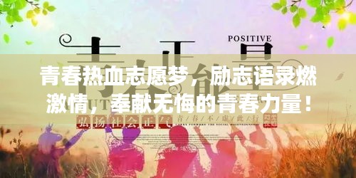 青春是一段美好的时光,志愿者身份让我们的人生更加精彩,在这个充满挑战和机遇的时代,让我们携手共进,为梦想努力,为青春奋斗,让我们在志愿服务的道路上,不断前行,为社会的进步和发展贡献自己的力量,让我们一起铭记这些青年志愿励志语录,燃烧青春,奉献无悔!