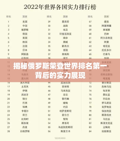俄罗斯以其强大的综合实力再次吸引了全球的关注,他们成功跃升至世界排名第一的宝座,这一荣誉的背后,是无数俄罗斯人民的努力与坚持,以及国家对科技、教育、经济等领域的持续投入。
